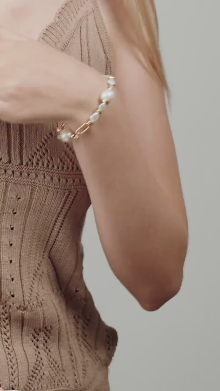 This minimalist bracelet features a modern paperclip chain design that beautifully contrasts with the organic, flowing shape of the pearls. The silver-tone white gold filled finish adds a touch of sophistication while ensuring durability and shine.